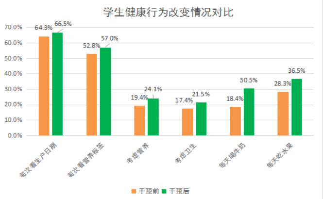 通過(guò)1學(xué)年的營(yíng)養(yǎng)教育活動(dòng),評(píng)估發(fā)現(xiàn),學(xué)生選擇經(jīng)常吃的零食中,水果類排名第一,占69.6%;糖果類由26.6%明顯下降至19.9%,降幅25%。經(jīng)常喝的飲料依次是白開(kāi)水、純牛奶酸奶、果汁和碳酸飲料,干預(yù)后白開(kāi)水和牛奶比例分別提升至83.4%和76.7%,升幅均超過(guò)10%;果汁和碳酸飲料分別降低至38.9%和17.3%,尤其是碳酸飲料降幅超過(guò)了30%。每天喝牛奶的比例明顯提升至30.5%,升幅65.8%;每天吃水果的比例提升至36.5%,升幅達(dá)到36.5%。每天吃早餐的比例由67.8%上升至74%。