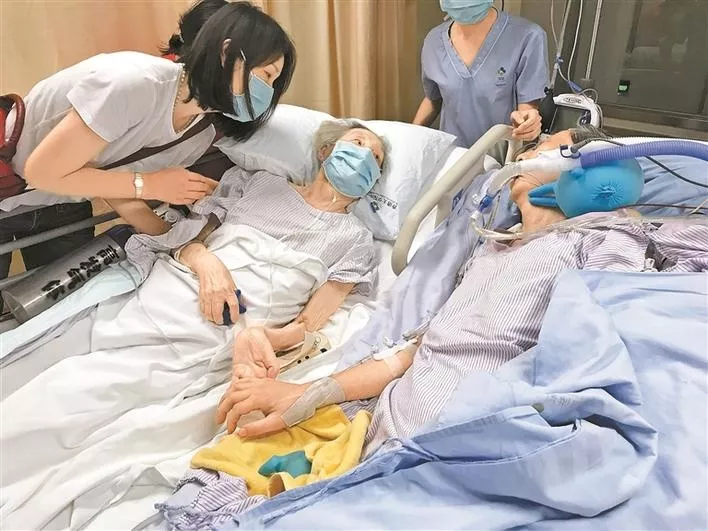 7月27日20點(diǎn)48分,香港大學(xué)深圳醫(yī)院的ICU病房里,兩位病重的老人的手握在了一起。在并排擺放的兩張病床上躺著的,是一對(duì)攜手恩愛(ài)57年的耄耋伉儷——高先生和彭女士。這兩位都已病重住院的老人,完成了或許是他們?nèi)松械淖詈笠幻妗_@一幕,讓病床邊的許多親屬和醫(yī)務(wù)人員都淚流滿面。