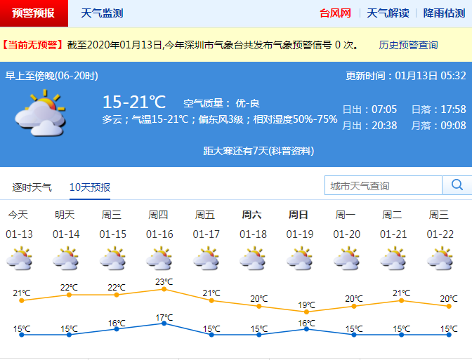 記者從深圳氣象局了解到,這周前期氣溫逐漸回升,后期氣溫小幅下降。周一到周四(13-16日)多云為主,氣溫逐漸回升,周一氣溫14-21℃,早上還較涼;周五至周日(17-19日)冷空氣影響,多云到陰天,沿海高地和海區(qū)有6-7級(jí)陣風(fēng),氣溫小幅下降,早晚較涼。