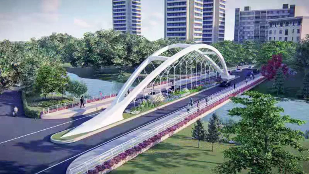 據(jù)介紹,凌菊路跨大沙河橋主體結(jié)構(gòu)需與大沙河生態(tài)長廊同步建設(shè),項(xiàng)目工期緊、任務(wù)重。根據(jù)相關(guān)規(guī)定,橋梁在河中不能設(shè)支墩,與大沙河河道需滿足2.5m的凈高要求,橋梁跨度大。最終,該項(xiàng)目采用下承式拱結(jié)構(gòu)鋼橋,鋼結(jié)構(gòu)橋梁可在工廠提前預(yù)制,運(yùn)輸至現(xiàn)場安裝,解決了技術(shù)和工期緊等難題。