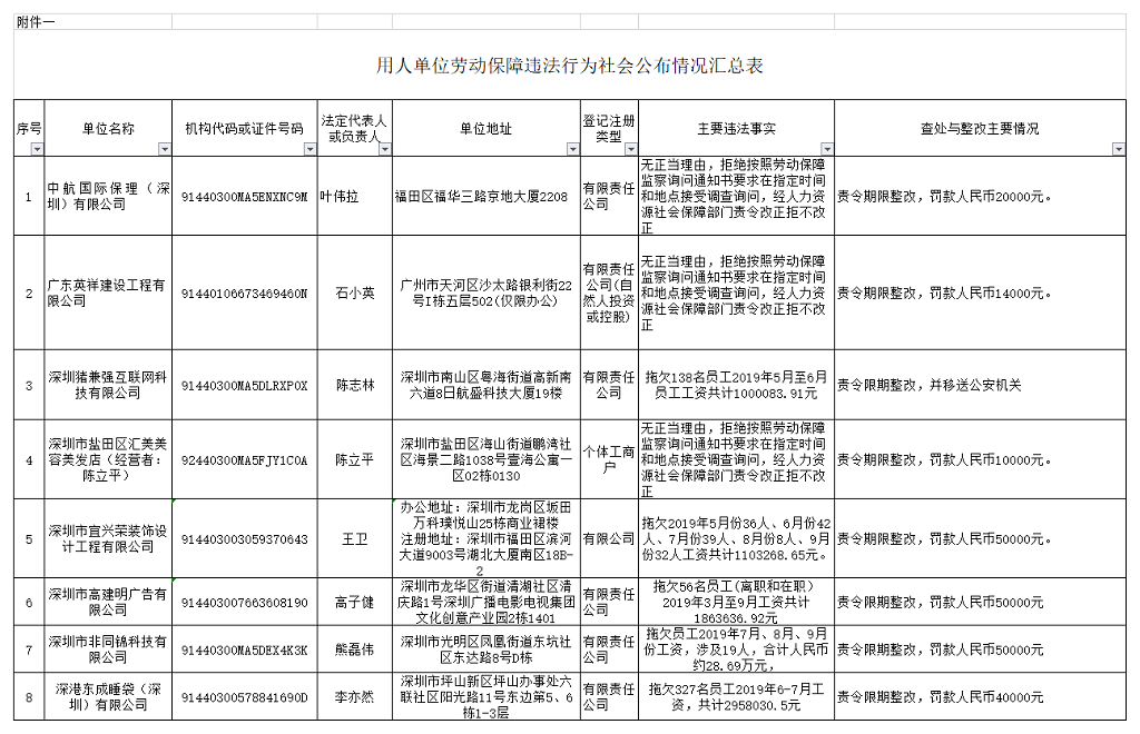 2019年第四季度,深圳市人力資源部門繼續(xù)加大對欠薪等勞動保障違法行為的打擊力度,依法處罰,對涉嫌犯罪的堅決移送司法機關,切實維護勞動者的合法權益。為加強對違法用人單位的社會監(jiān)督,強化誠信體系建設,加大威懾力,深圳市人力資源和社會保障局依據(jù)《廣東省用人單位重大勞動保障違法行為社會公布暫行規(guī)定》和《深圳市勞動保障違法信息公布辦法》,日前部分區(qū)(新區(qū))人力資源部門查處的一批勞動保障違法案件予以公布。
