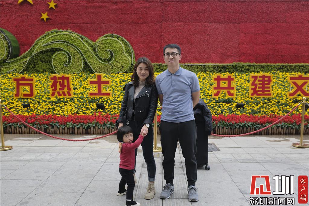 深圳北站東廣場,一位家長和孩子在“新年快樂”的牌子前合影留念。