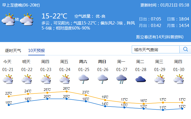 見(jiàn)圳客戶端·深圳新聞網(wǎng)2020年1月21日訊 據(jù)深圳市氣象臺(tái)消息,今日深圳多云,可見(jiàn)陽(yáng)光;氣溫15-22℃;偏東風(fēng)2-3級(jí),陣風(fēng)5-6級(jí);相對(duì)濕度60%-90%。預(yù)計(jì)早晨天氣偏涼,出門(mén)注意保暖,預(yù)防感冒。
