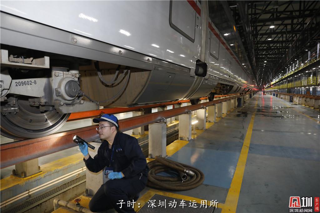 子時(shí):凌晨0點(diǎn)26分,深圳動(dòng)車(chē)運(yùn)用所檢修車(chē)間內(nèi),動(dòng)車(chē)地勤機(jī)械師陳愷正在給“下班”的動(dòng)車(chē)檢修。據(jù)了解,深圳動(dòng)車(chē)所的員工有600多人,平均年齡只有25歲,每年春節(jié),他們都要在動(dòng)車(chē)所里度過(guò)。