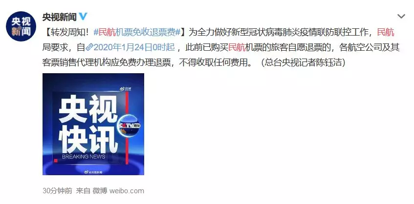 為全力做好新型冠狀病毒肺炎疫情聯(lián)防聯(lián)控工作,民航局要求,自2020年1月24日0時起,此前已購買民航機(jī)票的旅客自愿退票的,各航空公司及其客票銷售代理機(jī)構(gòu)應(yīng)免費(fèi)辦理退票,不得收取任何費(fèi)用。