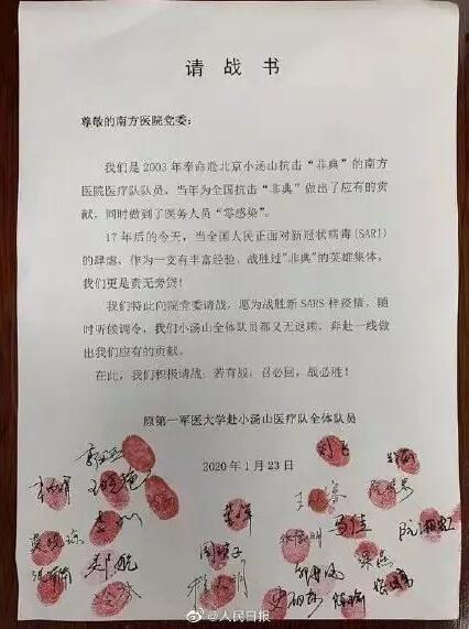 請(qǐng)戰(zhàn)的人員中,有十多年前曾遠(yuǎn)赴小湯山抗擊“非典”的隊(duì)員,有其他在職的醫(yī)生和護(hù)理工作者,還有表示“若有戰(zhàn),召必回!不計(jì)報(bào)酬,無(wú)論生死”的離退休老干部群體。一封寫(xiě)滿簽名并按滿紅手印的“請(qǐng)戰(zhàn)書(shū)”,就像跳動(dòng)著一顆顆紅心的畫(huà)卷,引發(fā)網(wǎng)友紛紛感動(dòng)留言。