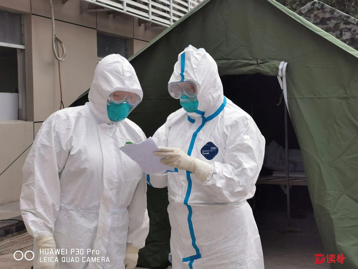 發(fā)熱門診護士在隔離觀察區(qū)進行病情交接