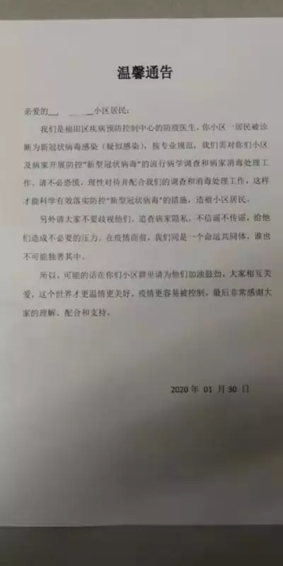 1月30日,由于深圳一小區(qū)出現(xiàn)新冠狀病毒疑似感染病例,福田區(qū)疾病預(yù)防控制中心的防疫醫(yī)生發(fā)布了這則通告。通告除了呼吁小區(qū)居民配合調(diào)查及消毒處理工作外,還特地懇請大家“不要歧視,在疫情面前,我們是同一個命運共同體,誰也不可能獨善其身?!辈恢獮楹危m不是湖北人也未曾受過歧視,但還是被這寥寥數(shù)字的“請求”溫暖了。