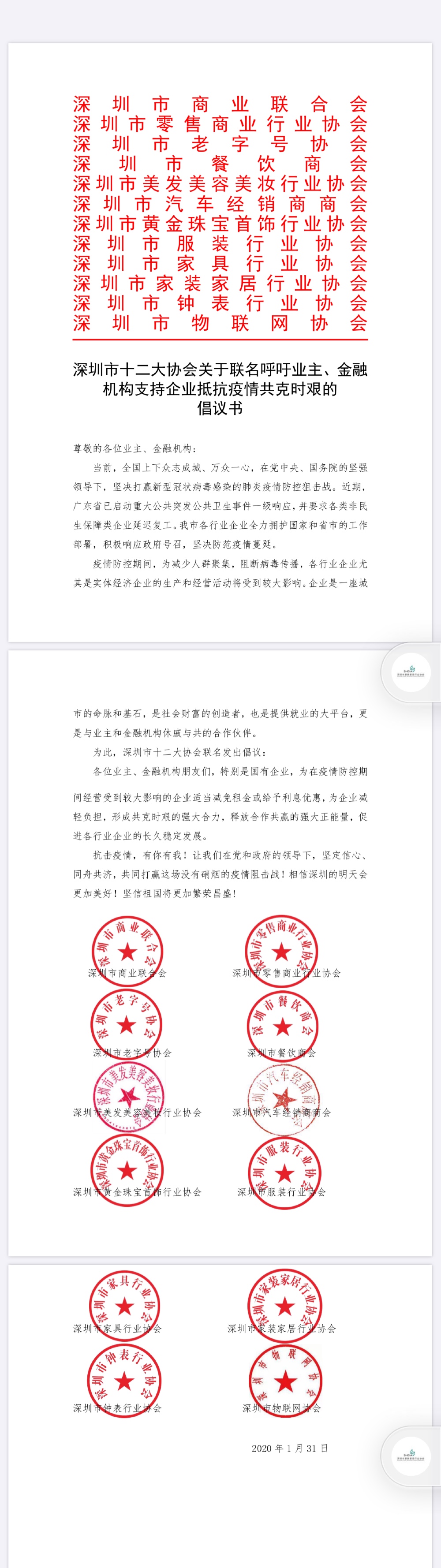 見圳客戶端·深圳新聞網(wǎng)2020年2月1日訊(見圳客戶端、深圳新聞網(wǎng)記者 金洪竹)1月31日深夜,一份特別的倡議書在網(wǎng)絡(luò)熱傳。深圳市商業(yè)聯(lián)合會(huì)、深圳市零售商業(yè)行業(yè)協(xié)會(huì)、深圳老字號(hào)協(xié)會(huì)、深圳市餐飲商會(huì)、深圳市美發(fā)美容美妝行業(yè)協(xié)會(huì)、深圳市汽車經(jīng)銷商協(xié)會(huì)、深圳市黃金珠寶首飾行業(yè)協(xié)會(huì)、深圳市服裝行業(yè)協(xié)會(huì)、深圳市家具行業(yè)協(xié)會(huì)、深圳市家裝家居行業(yè)協(xié)會(huì)、深圳市鐘表行業(yè)協(xié)會(huì)和深圳市物聯(lián)網(wǎng)協(xié)會(huì)等12家商協(xié)會(huì)發(fā)出聯(lián)名倡議,呼吁業(yè)主、金融機(jī)構(gòu)支持企業(yè)抵抗疫情、共克時(shí)艱。