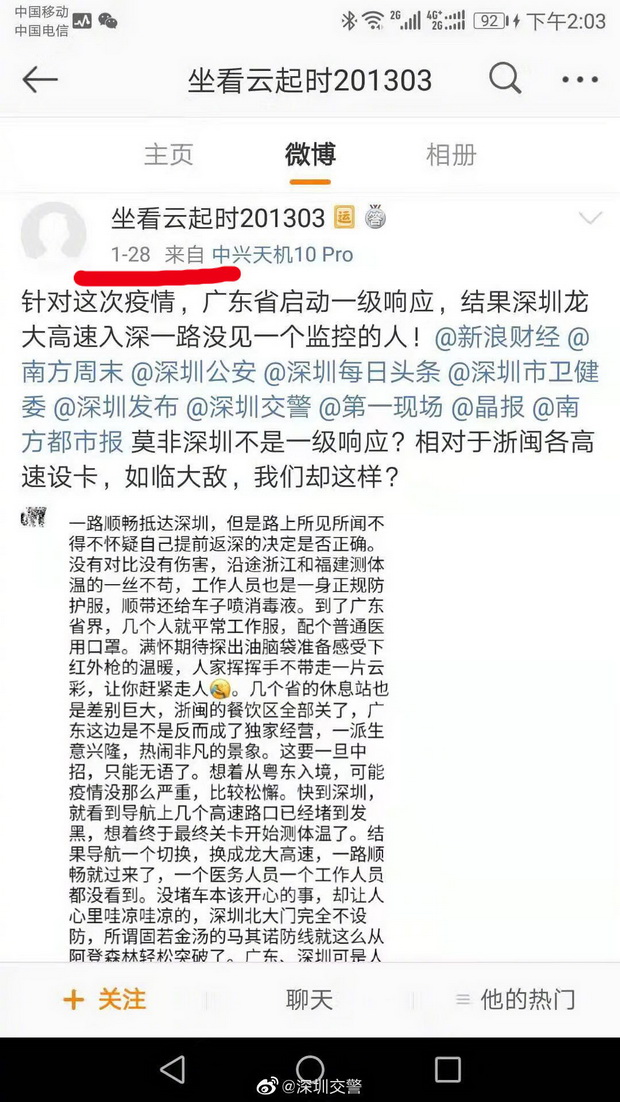 1月28日,有網(wǎng)友在社交軟件上稱深圳“不設(shè)防”,龍大高速無(wú)檢疫點(diǎn)。