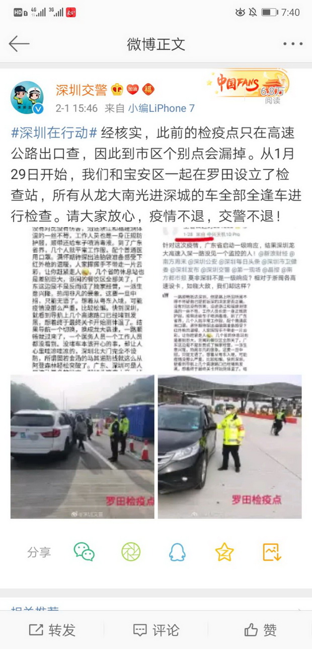2月1日下午,深圳交警在其官方微博上表示,經(jīng)核實(shí),此前的檢疫點(diǎn)只在高速公路出口查,因此到市區(qū)個(gè)別點(diǎn)會(huì)漏掉。從1月29日開(kāi)始,深圳交警和寶安區(qū)一起在羅田設(shè)立了檢查站,所有從龍大南光進(jìn)深城的車全部全逢車進(jìn)行檢查。請(qǐng)大家放心,疫情不退,交警不退。