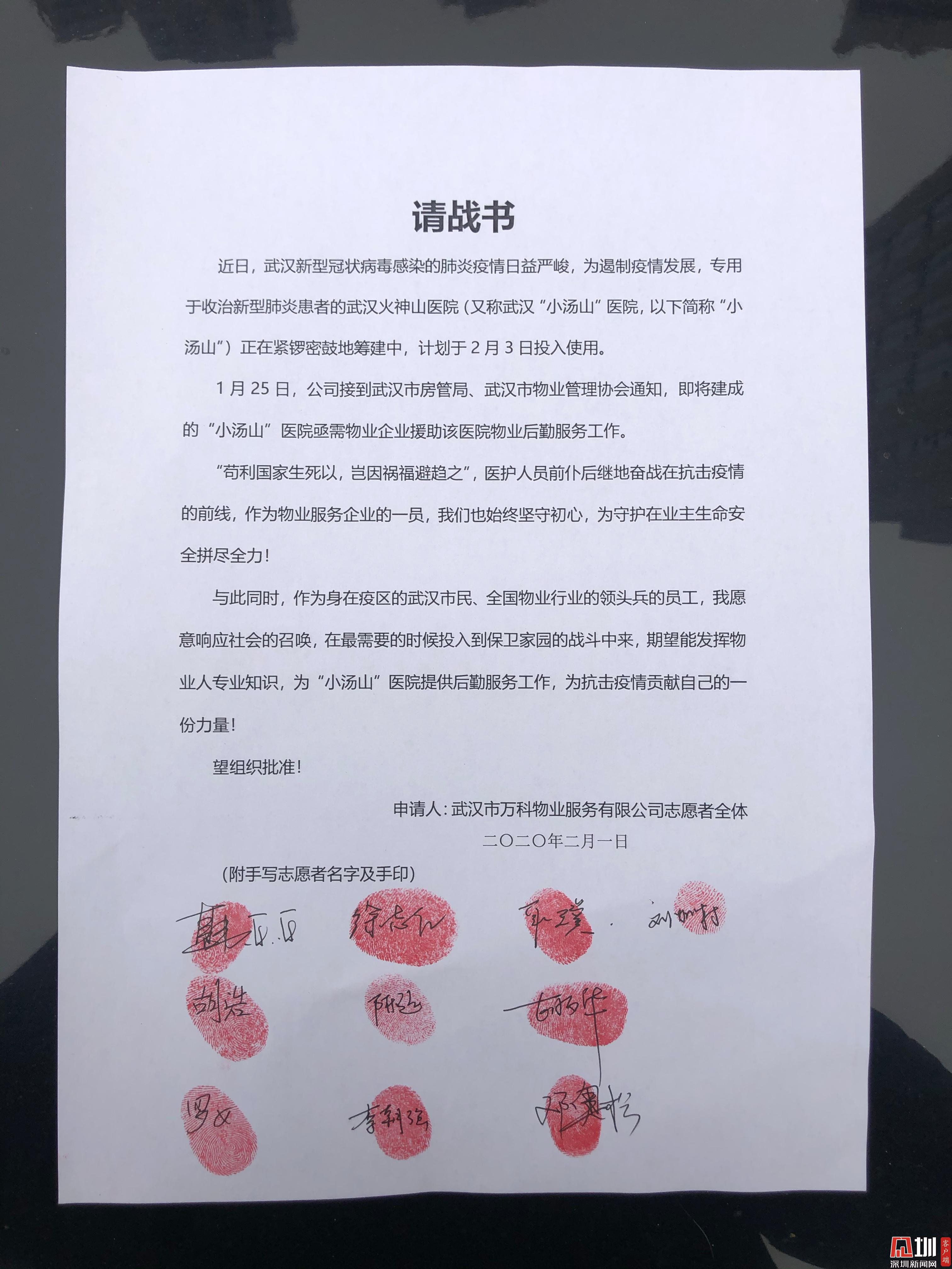 此次志愿者報名得到了大家的積極響應。1月25日,武漢萬科物業(yè)接到武漢市物業(yè)管理協(xié)會的通知,希望萬科物業(yè)征集20名志愿者支援武漢火神山醫(yī)院。當晚倡議書發(fā)出后,已有11人報名,到26日下午3時,報名人數增加到40人。這40位自愿報名者涵蓋了物業(yè)各個崗位,既有一線員工,也有物業(yè)管理人員。