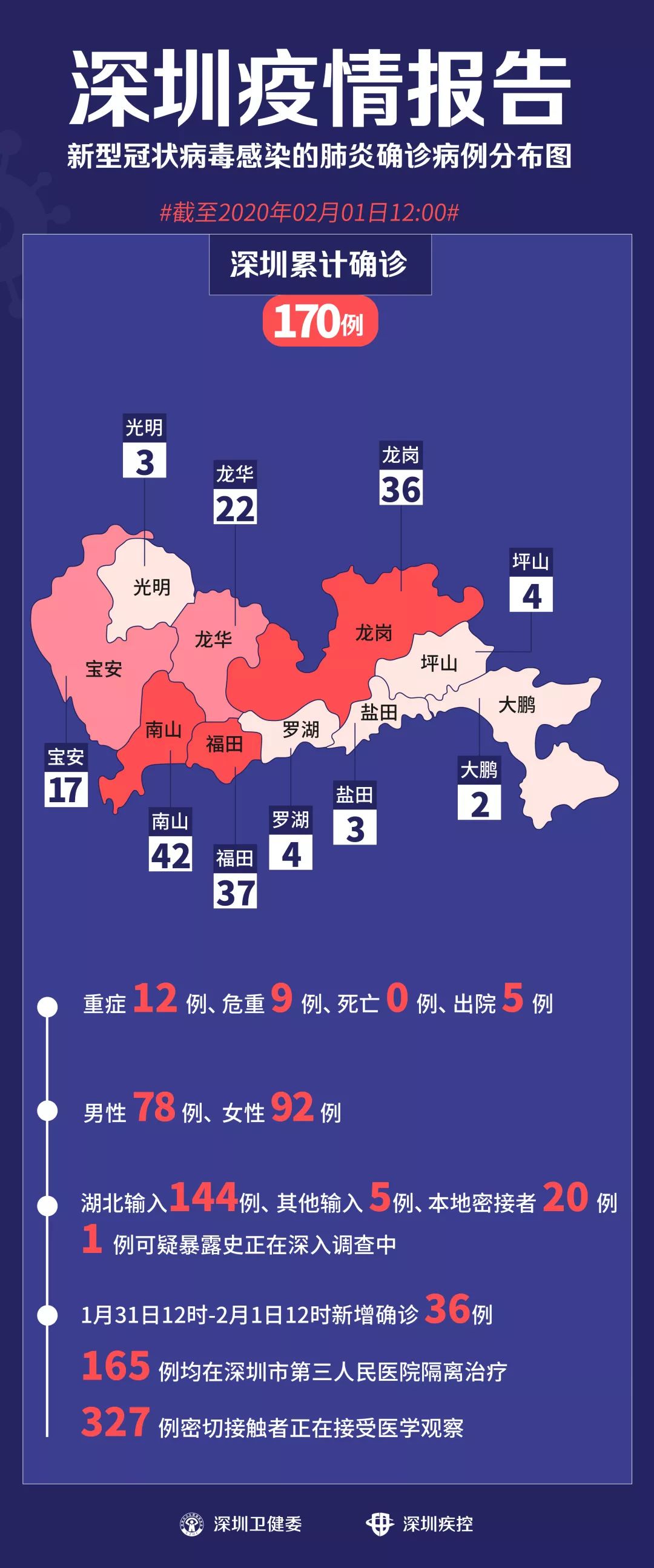 深圳病人糞便中檢出病毒陽(yáng)性 2月1日晚,深圳市第三人民醫(yī)院透露,該院肝病研究所發(fā)現(xiàn),在某些新型冠狀病毒感染的肺炎確診患者的糞便中檢測(cè)出2019-nCoV核酸(新型冠狀病毒)陽(yáng)性,很有可能提示糞便中有活病毒存在。目前研究人員正在做進(jìn)一步分離病毒的研究。 此外,國(guó)際醫(yī)學(xué)期刊《新英格蘭醫(yī)學(xué)雜志》最新刊登的一篇文章也透露,醫(yī)生們?cè)诿绹?guó)首位“新型肺炎”病人的腹瀉糞便樣本中檢測(cè)出了新型冠狀病毒的存在(rRT-PCR結(jié)果陽(yáng)性)。 在此提醒市民,一定要更加注意勤洗手,尤其是便后、飯前,一定要用流水+肥皂或洗手液,洗手20秒以上。 1月31日12時(shí)至2月1日12時(shí),深圳新增36個(gè)確診病例 病例135 47歲女性患者,常住北京。1月15日前往武漢探親,22日乘私家車前往深圳。1月23日發(fā)病,1月27日入院,目前情況穩(wěn)定。 病例136 病例98的女兒 4歲女性患者,常住湖北省十堰市。在密切接觸者采樣檢測(cè)中,發(fā)現(xiàn)新型冠狀病毒陽(yáng)性,故于1月27日入院,目前情況穩(wěn)定。 病例97:64歲男性患者,常住于湖北省十堰市。2020年1月22日抵達(dá)深圳,24日發(fā)病,26日入院就診。 病例98(病例97的兒子):40歲男性患者,常住于深圳市龍崗區(qū)。2020年1月22日,父親從湖北抵達(dá)深圳,24日發(fā)病,26日入院就診。 病例137 56歲男性患者,常住湖北省武漢市。1月21號(hào)前往深圳。1月26日發(fā)病,1月28日入院,目前情況穩(wěn)定。 病例138 59歲男性患者,常住深圳市龍華區(qū)。1月16日自駕從深圳前往武漢,1月23日開車回到深圳。1月26日發(fā)病,當(dāng)日入院,目前情況穩(wěn)定。 病例139 病例138妻子 57歲女性患者,常住深圳市龍華區(qū)。1月16日自駕深圳前往武漢,1月23日開車回到深圳。1月24日發(fā)病,1月26日入院,目前情況穩(wěn)定。 病例140 66歲女性患者,常住湖北省武漢市。1月22日前往深圳。1月23日發(fā)病,1月28日入院,目前情況穩(wěn)定。 病例141 78歲男性患者,常住湖北省武漢市。1月16日前往深圳探親。1月26日發(fā)病,1月27日入院,目前情況穩(wěn)定。 病例142 61歲女性患者,常住湖北省武漢市。1月21日前往深圳探親。1月22日發(fā)病,1月28日入院,目前情況穩(wěn)定。 病例143 54歲男性患者,常住深圳市南山區(qū)。1月21日前往武漢,23日返回深圳。1月25日發(fā)病,1月28日入院,目前情況穩(wěn)定。 病例144 55歲女性患者,常住深圳市南山區(qū)。1月21日由深圳前往武漢,23日返回深圳。1月24日發(fā)病,1月29日入院,目前情況穩(wěn)定。 病例145 57歲女性患者,常住深圳市南山區(qū)。1月13日從深圳到武漢探親,1月23日從武漢自駕返回深圳。1月26日發(fā)病,1月27日入院,目前情況穩(wěn)定。 病例146 病例29父親 76歲男性患者,常住湖北省武漢市。1月15日從武漢出發(fā)前往廣西南寧旅游,1月18日從廣西南寧出發(fā)前往深圳探親。1月27日發(fā)病,1月28日入院,目前情況穩(wěn)定。 病例29:49歲女性患者,長(zhǎng)期居住湖北武漢,2020年1月15日從武漢到廣西南寧,18日從南寧到佛山,20日從佛山抵達(dá)深圳,21日發(fā)病,22日入院就診。 病例147 病例105的女兒 6歲女性患者,常住深圳市羅湖區(qū)。1月12日前往武漢,1月22日乘私家車前往河南信陽(yáng),23日乘私家車前往深圳。在密切接觸者采樣檢測(cè)中發(fā)現(xiàn),新型冠狀病毒陽(yáng)性,故于1月28日入院,目前情況穩(wěn)定。 病例105:35歲男性患者,常住于深圳市羅湖區(qū)。2020年1月17日自駕車由深圳開往武漢,22日自駕車從武漢開往河南信陽(yáng)探親,23日自駕車從河南信陽(yáng)開往深圳,當(dāng)日發(fā)病,25日入院就診。 病例106(病例105妻子):36歲女性患者,常住于深圳市羅湖區(qū)。2020年1月17日乘私家車由深圳到武漢,22日乘私家車從武漢到河南信陽(yáng)探親,23日乘私家車從河南信陽(yáng)到深圳,24日發(fā)病,25日入院就診。 病例107(病例105丈母娘):61歲女性患者,常住于深圳市羅湖區(qū)。1月12日從深圳前往武漢,22日乘私家車從武漢到河南信陽(yáng)探親,23日乘私家車從河南信陽(yáng)到深圳,24日發(fā)病,25日入院就診。 病例148 38歲女性患者,常住深圳市福田區(qū)。1月23日接觸從武漢來(lái)深的父母(都未確診)。1月27日發(fā)病,當(dāng)日入院,目前情況穩(wěn)定。 病例149 33歲女性患者,常住深圳市福田區(qū)。1月19日前往武漢,乘私家車到潛江探親,1月24日乘私家車返回深圳。1月28日發(fā)病,當(dāng)日入院,目前情況穩(wěn)定。 病例150 49歲男性患者,常住深圳市龍華區(qū)。1月18日前往武漢探親,1月23日回到深圳。1月25日發(fā)病,1月27日入院,目前情況穩(wěn)定。 病例151 病例150的女兒 18歲女性患者,常住深圳市龍華區(qū)。1月18日前往武漢探親,1月23日回到深圳。1月25日發(fā)病,1月29日入院,目前情況穩(wěn)定。 病例152 56歲女性患者,常住江蘇省南京市。1月21日乘私家車到武漢,1月22日前往深圳。1月26日發(fā)病,當(dāng)日入院,目前情況穩(wěn)定。 病例153 病例84的丈夫 58歲男性患者,常住深圳市龍華區(qū)。在密切接觸者采樣檢測(cè)中發(fā)現(xiàn),新型冠狀病毒陽(yáng)性,故于1月29日入院,目前情況穩(wěn)定。 病例84:52歲女性患者,常住深圳市龍華區(qū)。2020年1月19日至22日在武漢,22日-23日從武漢到仙桃市探親,23日發(fā)病,24日駕車至長(zhǎng)沙,25日從