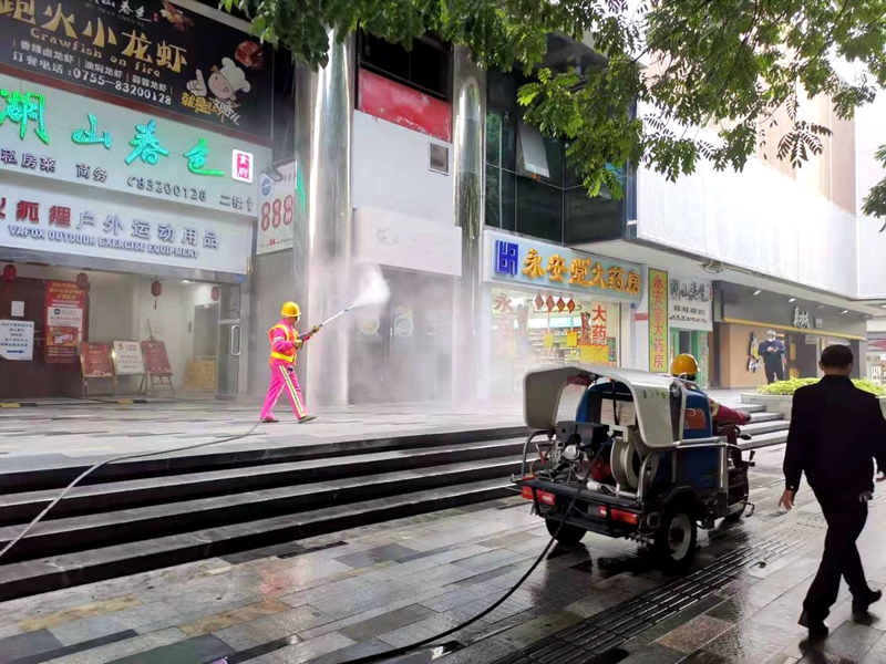 航苑大廈西座位于福田區(qū)華強北街道華航社區(qū),當(dāng)天下午,記者在航苑西座看到,有兩名值班保安在門口嚴(yán)格把關(guān),對每個進入小區(qū)的住戶進行體溫檢測。一輛灑水車正在圍繞小區(qū)噴灑消毒液。