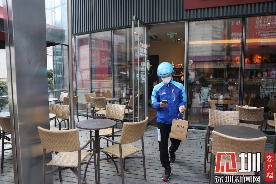 在咖啡店等待商家制作完成,取貨后,王彭輝便馬不停蹄地騎著電動(dòng)車(chē)前往訂單上的地址。平日繁華的南山商區(qū),現(xiàn)在空空蕩蕩的,除了偶爾有車(chē)輛開(kāi)過(guò),路上幾乎都是外賣(mài)小哥、快遞小哥的身影,“現(xiàn)在就是大家都待在家里,路上人和車(chē)少了,我們也能更快地把訂單送達(dá)?!蓖跖磔x說(shuō):“我以前是在梅林那邊工作,剛開(kāi)始來(lái)南山這邊送外賣(mài)的時(shí)候,對(duì)這里的路不熟悉,覺(jué)得每個(gè)路口都長(zhǎng)得一樣,抬頭都是大廈,低頭都是人,但是做得久了以后,慢慢的就熟悉了。”