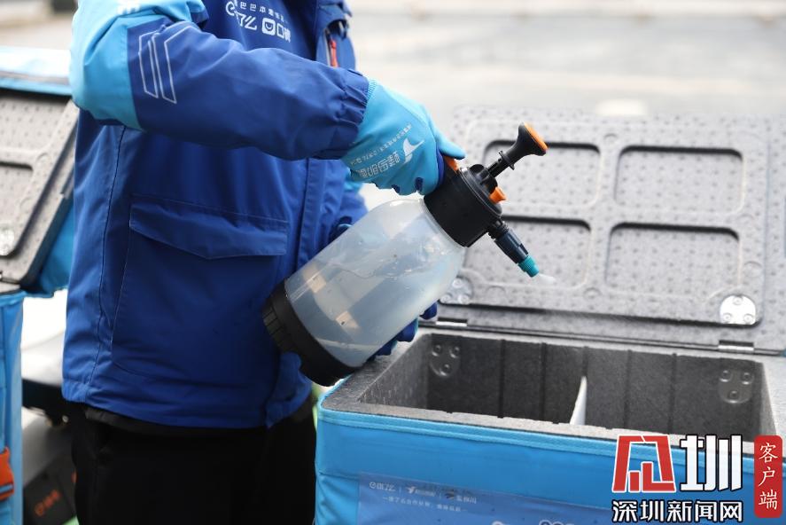 外賣(mài)小哥向保溫箱內(nèi)噴灑消毒液進(jìn)行消毒。
