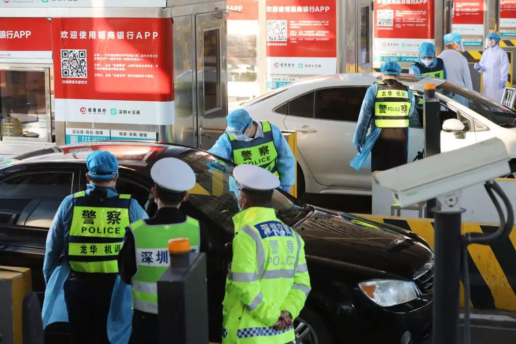 2月2日中午,深晚記者來到梅觀高速觀瀾收費(fèi)站,發(fā)現(xiàn)這里開通了4條車道供車輛通行,現(xiàn)場有超過20名民警、醫(yī)務(wù)人員檢測入深車輛司乘人員的體溫。