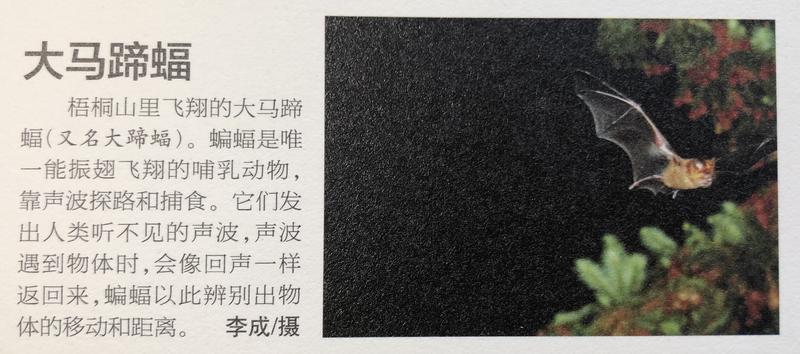“我是在梧桐山附近仙湖植物園拍到的大馬蹄蝠。每到傍晚,仙湖植物園進出園區(qū)的那條路上,都有數(shù)量比較多的大馬蹄蝠在那飛。當時有幾棵樹在開花,我拍了好幾張終于抓拍到一張清晰的?!?月4日,李成在回憶當年拍攝經(jīng)歷時說,當時蝙蝠群距離他最近的有2-3米,最遠的有10多米。