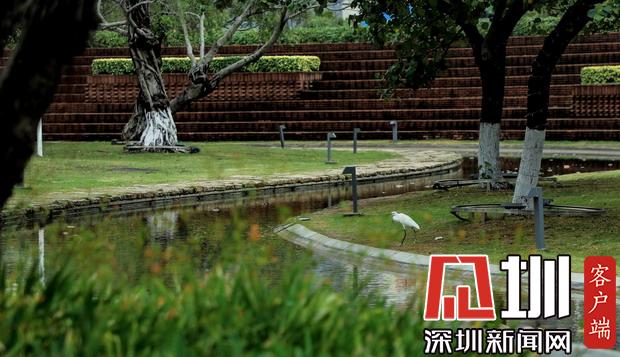 海濱廣場,一只白鷺棲息在無人的草地上悠閑的踱步。