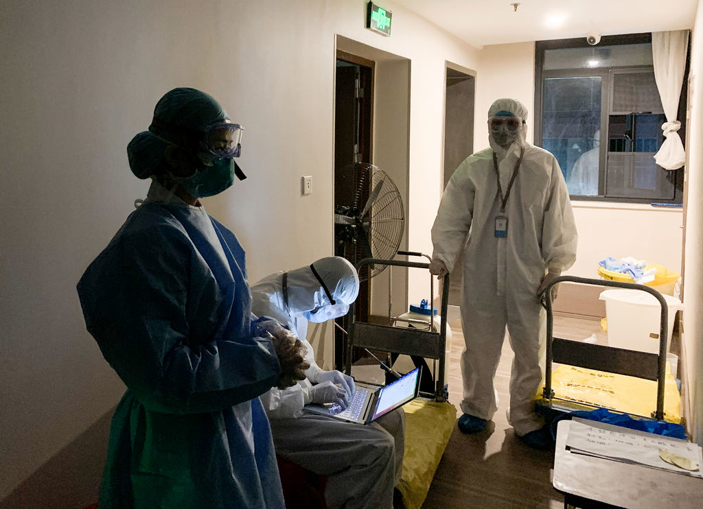 2月5日晚,因周邊電路損壞導(dǎo)致健康驛站突然斷電,廣中醫(yī)深圳醫(yī)院的醫(yī)護(hù)人員在生活區(qū)用手機(jī)燈光照明工作,他們記錄體溫,清點消毒、防護(hù)裝備、統(tǒng)計人員生活用品數(shù)據(jù),稍微閑下來的時候,他們還要通過驛站家園群安慰恐慌、不安的“家人們”。