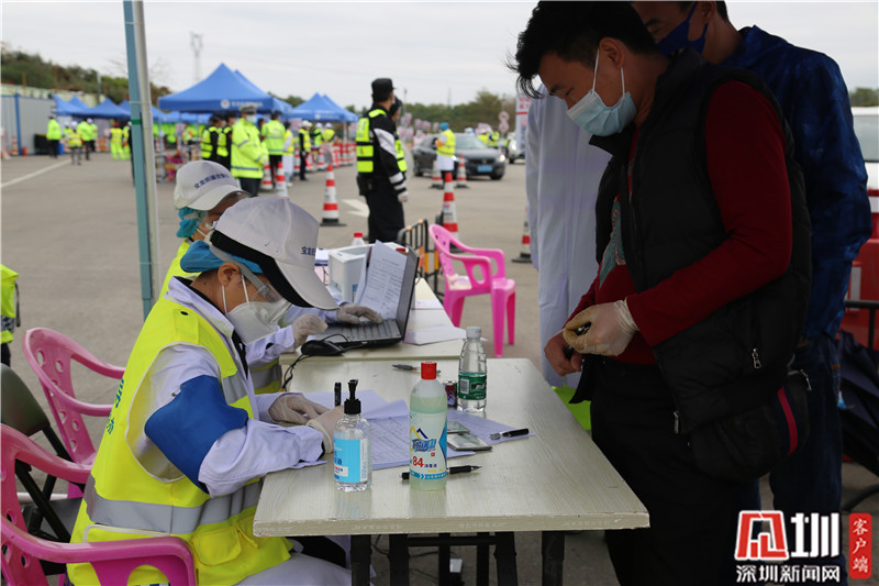 龍崗區(qū)文化館工作人員楊麗(右)負(fù)責(zé)檢查卡點(diǎn)復(fù)檢區(qū)資料錄入工作。
