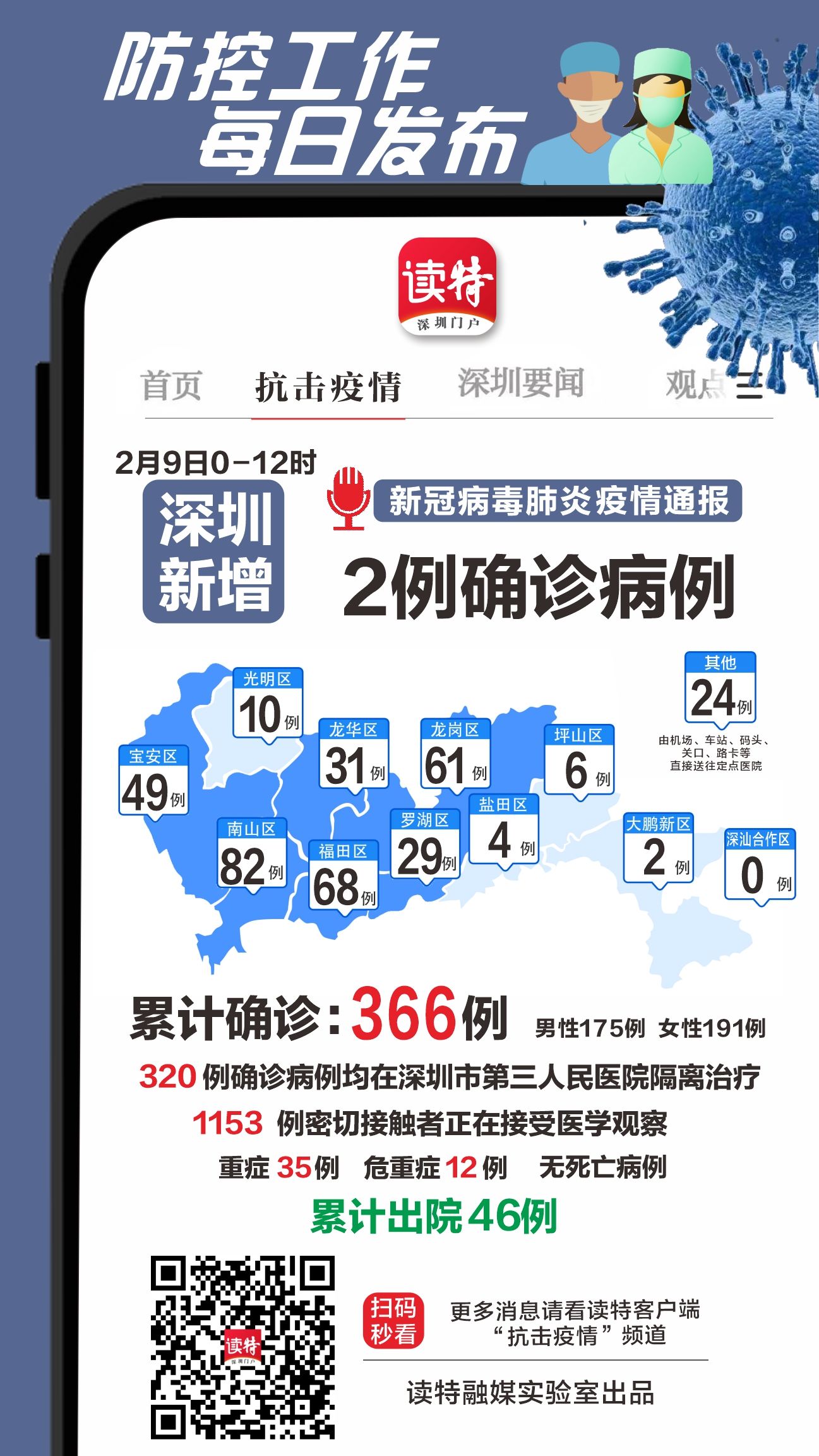 2020年2月9日0時(shí)至12時(shí),深圳市報(bào)告新型冠狀病毒感染的肺炎新增確診病例2例,累計(jì)確診366例(個(gè)案詳情今晚公布)。