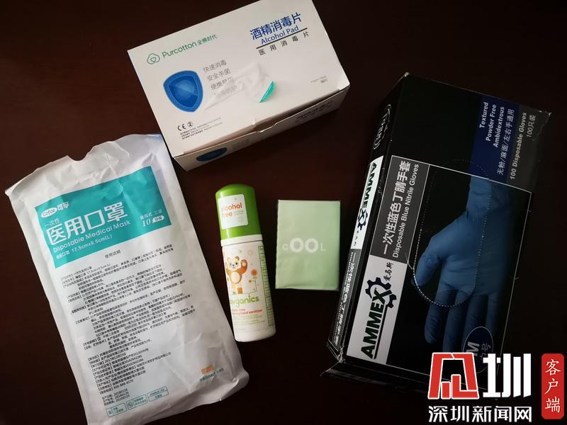 家住福田,在羅湖上班的丘小姐今天也開始了他的復(fù)工第一天,為了在路上做好防護(hù),她準(zhǔn)備了一次性雨衣、鞋套、手套及眼鏡,當(dāng)然口罩必不可少,她還隨身攜帶了含有酒精的免洗洗手液,以備接觸了可疑物品之后能馬上自我消毒。