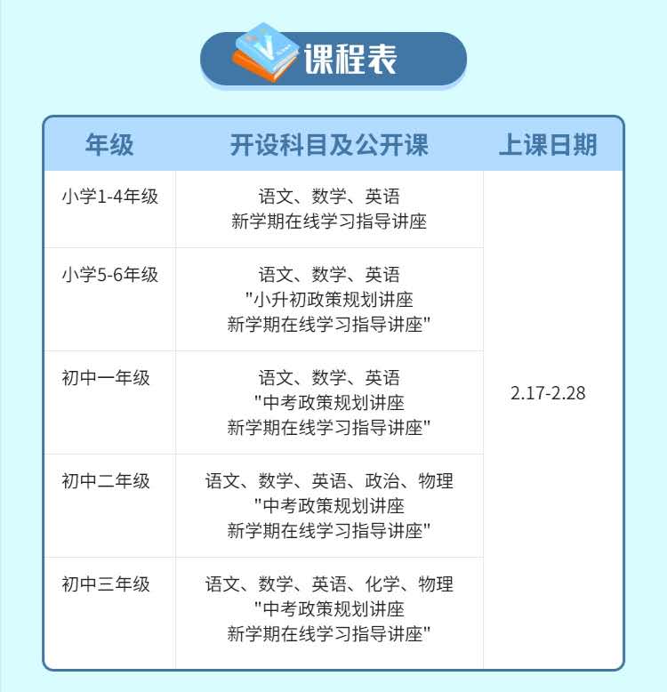 據(jù)悉,本次公益校內(nèi)同步直播課程涵蓋各年級(1-9年級),各學科(語文、數(shù)學、英語、政治、物理、化學等)?!案采w廣、課程精、師資強、服務(wù)優(yōu)、全免費”是本次直播課程的特色亮點。