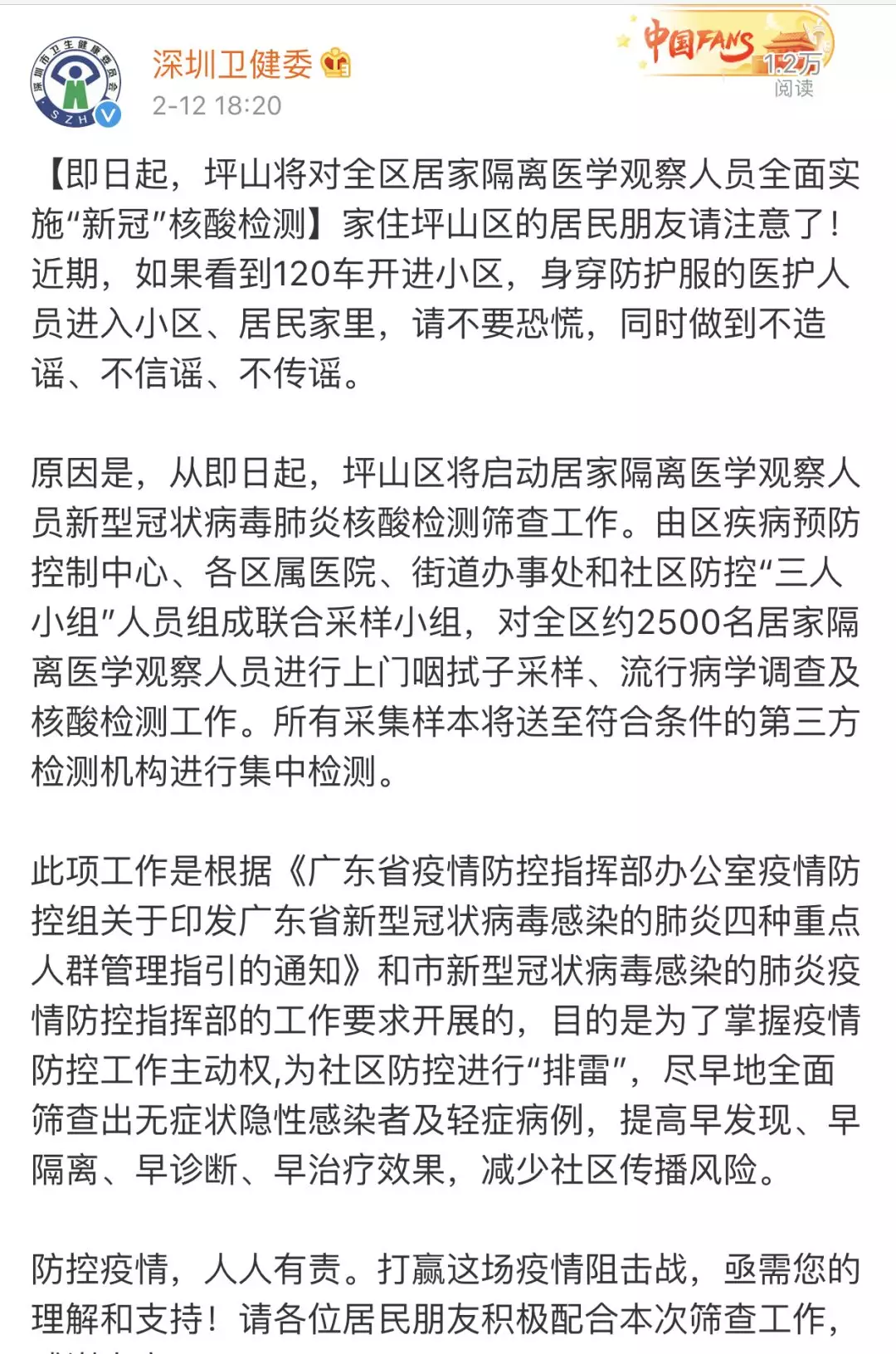 徹底“排雷”!深圳免費(fèi)為所有居家隔離者檢測“新冠”病毒核酸