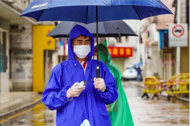 除了他們,還有很多人也冒雨奮戰(zhàn)在抗疫第一線:防控檢疫員、社區(qū)網格員、義工、快遞小哥等等