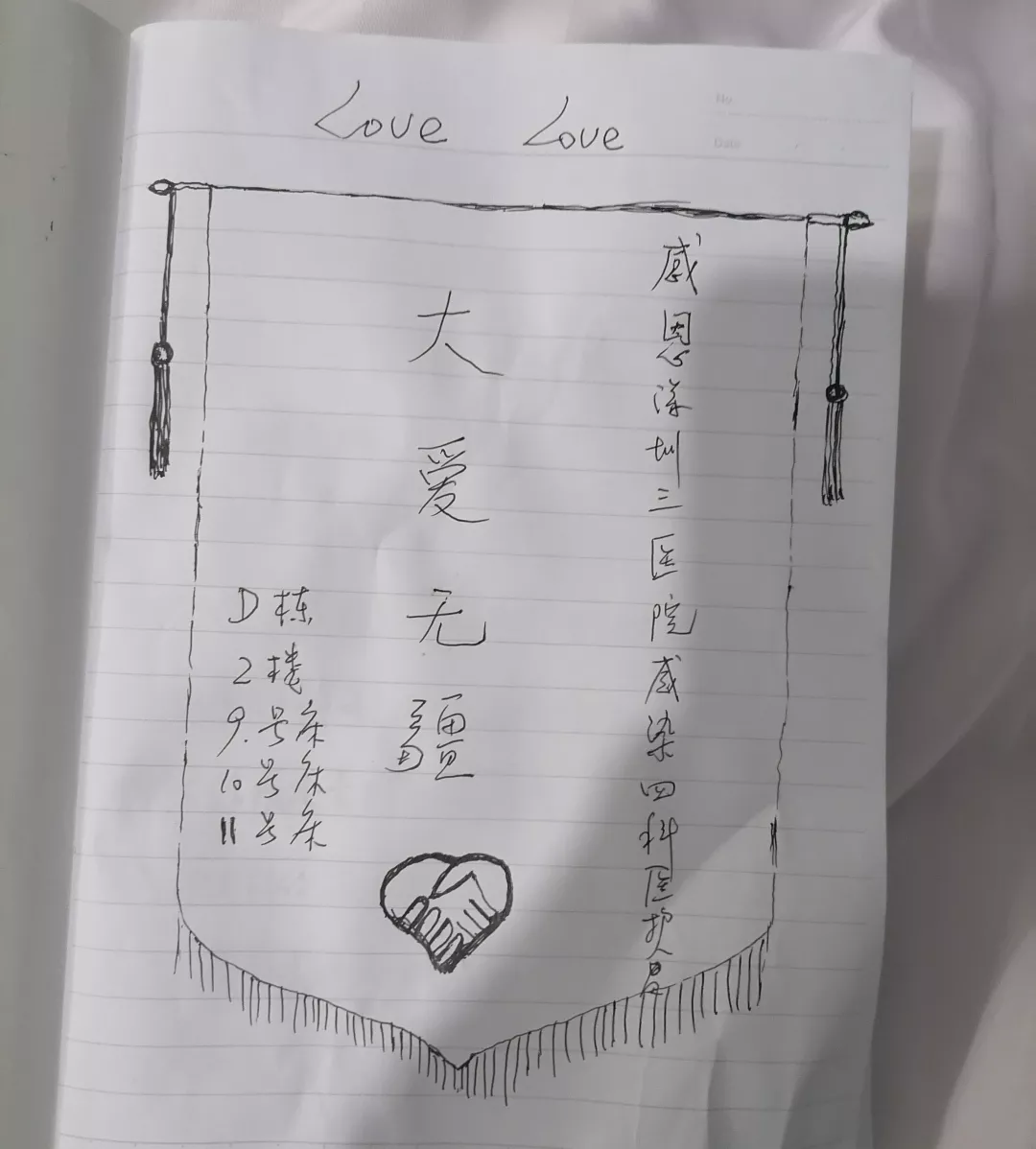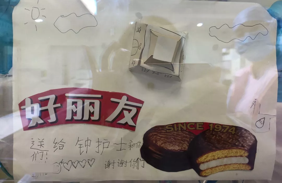 2月11日,深圳市三醫(yī)院兒科護(hù)士們收到了一個(gè)用好麗友餅干盒制作的手工賀卡,上面寫(xiě)著“送給鐘護(hù)士和你們!謝謝你們”,賀卡上還畫(huà)了一張笑臉和四個(gè)心形。