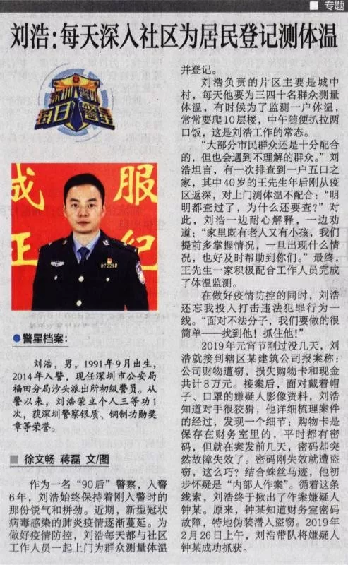 作為一名“90后”警察,入警6年,劉浩始終保持著剛入警時的那份銳氣和拼勁。近期,新型冠狀病毒感染的肺炎疫情逐漸蔓延。為做好疫情防控,劉浩每天都與社區(qū)工作人員一起上門為群眾測量體溫并登記。