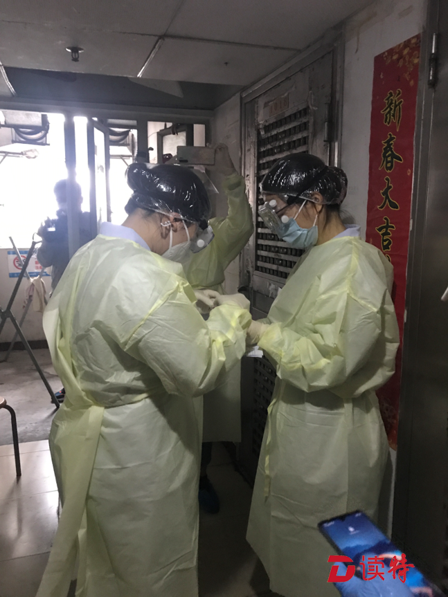 孫女士打開(kāi)門(mén),將工作人員遞進(jìn)去的防護(hù)裝備穿戴完畢?!盀榱吮Wo(hù)醫(yī)護(hù)人員的安全,減少交叉感染的可能性,所有的上門(mén)檢測(cè)都會(huì)在樓道里進(jìn)行?!鄙缈抵行墓ぷ魅藛T說(shuō)。提前穿好防隔服等防護(hù)裝備、拿檢測(cè)時(shí)給居民坐的凳子、為凳子消毒,開(kāi)始進(jìn)行檢測(cè)前就需要做很細(xì)致的準(zhǔn)備工作。