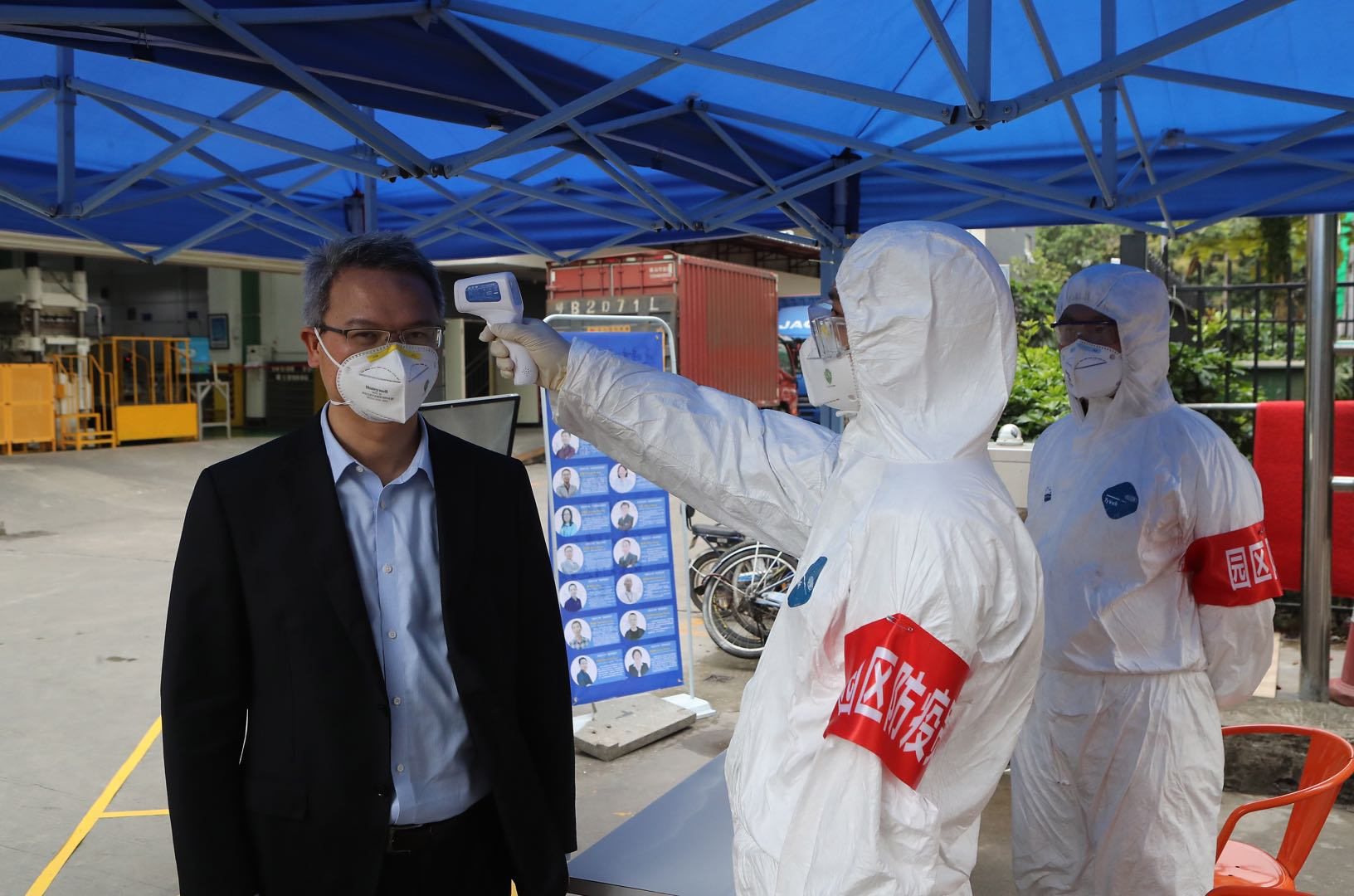記者驅(qū)車來(lái)到該公司園區(qū)門口時(shí),就可以見(jiàn)到工作人員正在對(duì)進(jìn)入園區(qū)的車輛進(jìn)行消殺,在門口,還有多個(gè)海報(bào)上寫著進(jìn)入園區(qū)后的一些注意事項(xiàng),例如在公司就餐的注意事項(xiàng)、自覺(jué)接受體溫測(cè)量和注意佩戴口罩等。