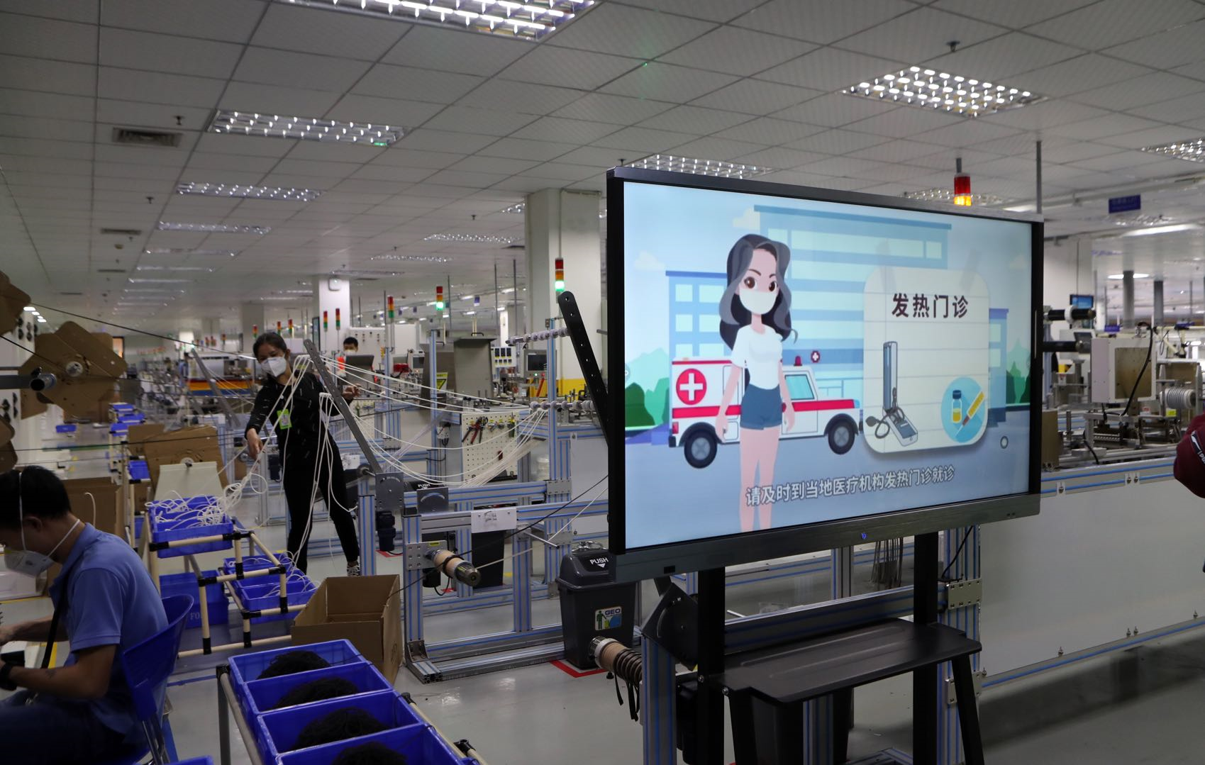 這樣的座位安排方式和擋板在員工食堂同樣可以看到。不同的是,就餐員工被嚴格分流,采取多時段少人次的方式分時段分批就餐。