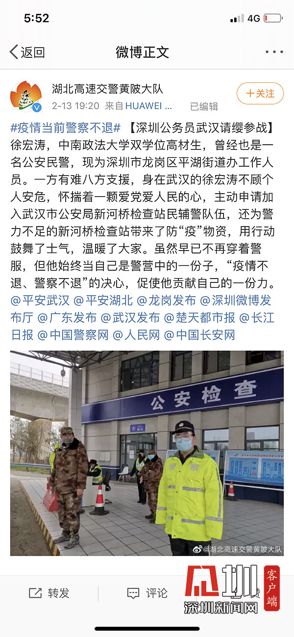 見圳客戶端、深圳新聞網(wǎng)2月16日訊(見圳客戶端、深圳新聞網(wǎng)記者 張凡 通訊員 李上彪 謝華庚)2月15日早上7點,來自深圳市龍崗區(qū)平湖街道的黨員徐宏濤就站在了武漢新河公安檢查站的崗位上,開始一天的志愿輔警工作。他是龍崗區(qū)平湖街道黨工委辦公室主任,因春節(jié)回家探親滯留武漢,這些天來,他懷揣著一顆愛黨愛人民的心,主動申請加入武漢市公安局新河檢查站民輔警隊伍,還為警力不足的檢查站帶來了防疫物資,他用行動回報這片生于斯長于斯的土地,更展現(xiàn)了一名龍崗優(yōu)秀黨員的擔當與風貌。
