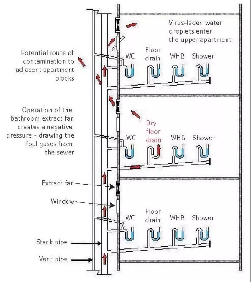由于干涸的U型管內存在帶病毒的污染物,而這些污染物處于暴露狀態(tài),可能通過地漏、甚至排風扇循環(huán)等其中的污染顆粒被人吸入導致感染。