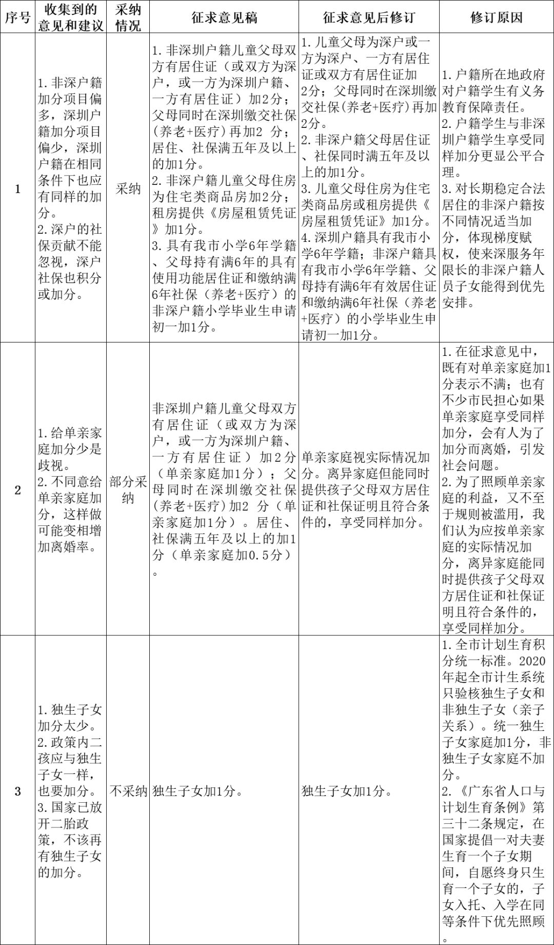 據(jù)了解,1月13日-24日,《羅湖區(qū)義務(wù)教育學(xué)位申請(qǐng)分類(lèi)和積分辦法(征求意見(jiàn)稿)》在“羅湖政府在線”和“羅湖教育應(yīng)用網(wǎng)”公開(kāi)征求公眾意見(jiàn)期間,共計(jì)收集市民意見(jiàn)和建議共205條。其中郵件106封,信函2件,電話97個(gè)。經(jīng)過(guò)梳理,區(qū)教育局將比較具有普遍性、代表性的意見(jiàn)和建議進(jìn)行了研究分析,對(duì)合理化意見(jiàn)和建議予以采納。