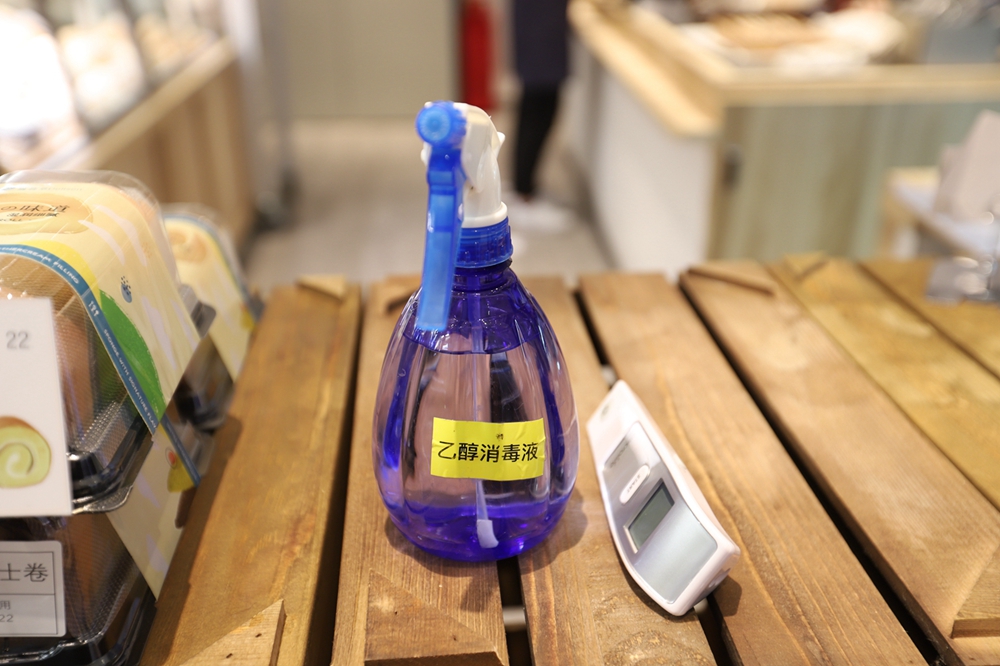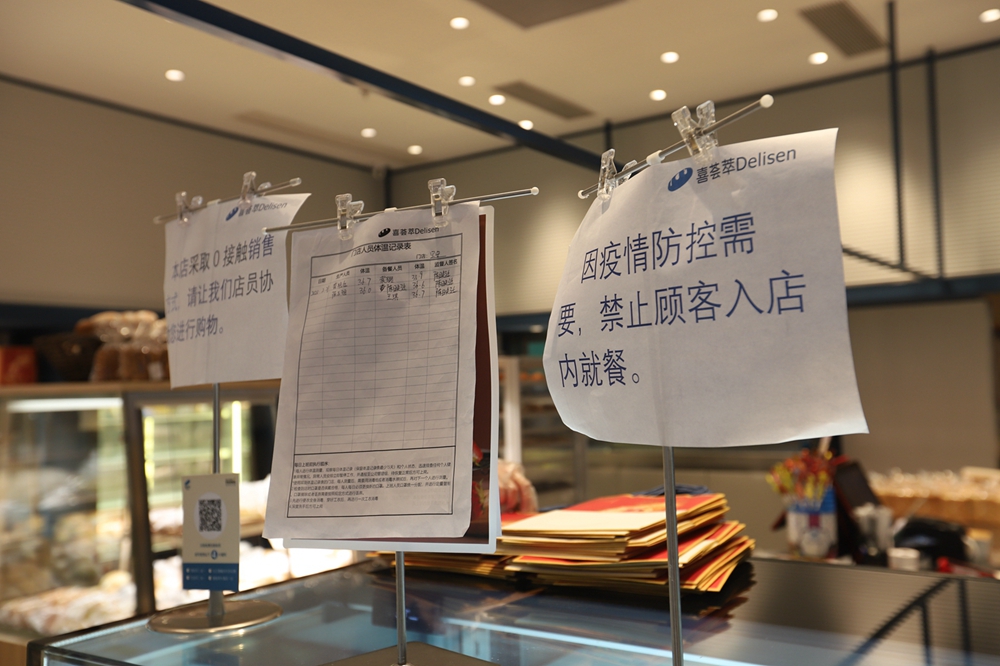 負二樓的喜薈萃是一家剛開業(yè)沒多久的面包店,記者看到里面燈光明亮、各式面包充盈貨賀,進店的通道已全部攔堵,并設置了取餐及消毒區(qū)。一名市民正在選購面包,他站在店外選好款式后,店員將面包打包好并放在取餐處,市民掃碼付款后就可以帶走了。這就是商場內(nèi)實行的“零接觸”購物。