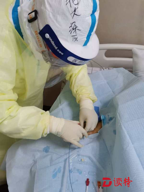 深圳醫(yī)療隊(duì)臨時黨支部書記王玲在監(jiān)利縣中醫(yī)院重癥病房為患者植入PICC導(dǎo)管。