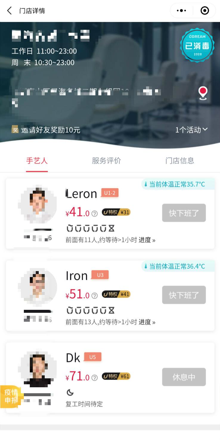 ▲通過(guò)線上平臺(tái),顧客可以清晰了解門(mén)店消毒情況及理發(fā)師個(gè)人體溫。