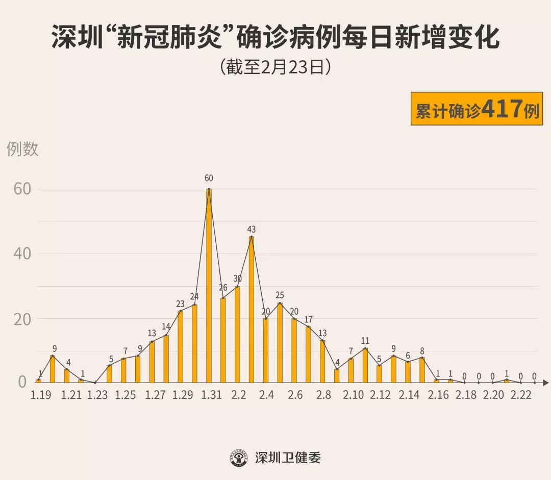 截至2月23日24時(shí),深圳累計(jì)報(bào)告“新冠肺炎”確診病例417例。2月23日當(dāng)天全市無(wú)新增確診病例。 ▲新增出院病例已超過(guò)新增確診病例 累計(jì)報(bào)告確診病例中,男性197例、女性220例。 按照病例管理地區(qū)劃分,南山區(qū)87例、福田區(qū)81例、龍崗區(qū)71例、寶安區(qū)62例、龍華區(qū)34例、羅湖區(qū)32例、光明區(qū)11例、坪山區(qū)7例、鹽田區(qū)6例、大鵬新區(qū)2例、其他(指由機(jī)場(chǎng)、車(chē)站、碼頭、關(guān)口、路卡等直接送往定點(diǎn)醫(yī)院的)24例。 目前,重癥5例、危重癥8例,死亡3例,累計(jì)出院237例。 177例確診病例均在深圳市第三人民醫(yī)院隔離治療。 159例密切接觸者正在接受醫(yī)學(xué)觀察。 資料來(lái)源:深圳市疾控中心、深圳市衛(wèi)健委、廣東省衛(wèi)健委