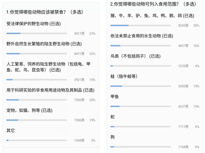 網(wǎng)友投出9011票,贊成“受法律保護(hù)的野生動(dòng)物”應(yīng)該被禁食,占比23%;另有8471票,22%的網(wǎng)友支持禁食“野外自然生長(zhǎng)繁殖的陸生野生動(dòng)物”。對(duì)于“用于科研實(shí)驗(yàn)的非食用用途動(dòng)物及其制品”選項(xiàng),有20%的網(wǎng)友(7560票)支持禁食。禁食的投票選項(xiàng)中,還有19%的網(wǎng)友贊成禁食貓狗等寵物(7386票),10%的網(wǎng)友贊成禁食包括龜、甲魚、蛇、鳥、昆蟲等人工繁育、飼養(yǎng)的陸生野生動(dòng)物,票數(shù)為3921票。