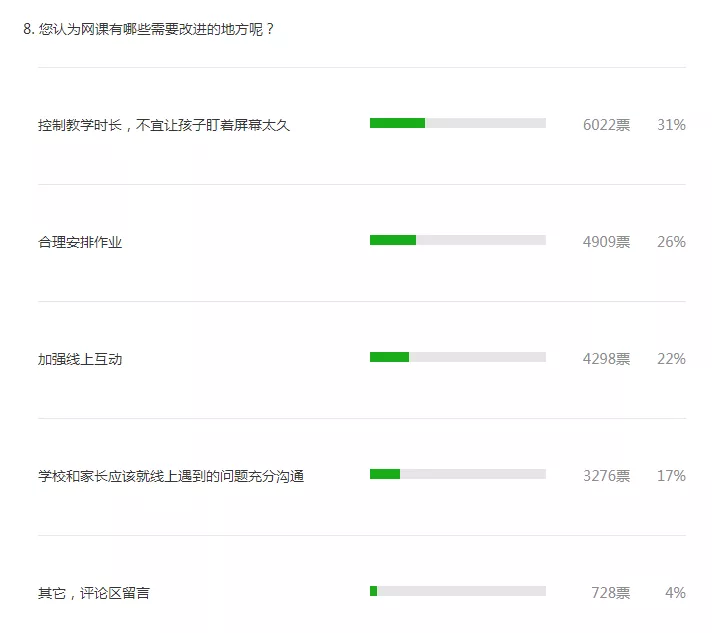 此外,22%的參與者認(rèn)為,網(wǎng)課缺乏教學(xué)氛圍,無(wú)法真正實(shí)現(xiàn)互動(dòng)式在線課堂。有家長(zhǎng)認(rèn)為,目前老師用群進(jìn)行講解,聊天消息過(guò)多,信息雜亂,老師無(wú)法及時(shí)答疑,建議老師通過(guò)小視頻等形式將熱點(diǎn)問(wèn)題再進(jìn)行補(bǔ)充講解。