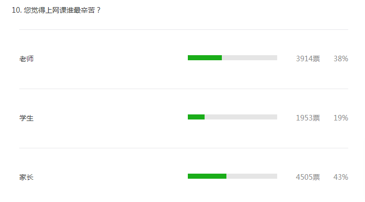 關(guān)于上網(wǎng)課誰(shuí)最辛苦,有43%的參與者認(rèn)為家長(zhǎng)最辛苦,38%認(rèn)為老師更辛苦。