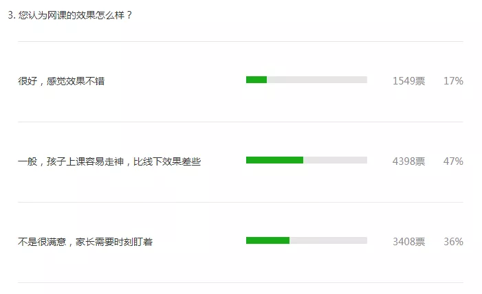 網(wǎng)課的效果到底如何?根據(jù)深圳新聞網(wǎng)的調(diào)查,64%的參與者對(duì)網(wǎng)課效果感到“滿意”或“一般”。多數(shù)參與者認(rèn)為“孩子容易走神”或“需要家長(zhǎng)時(shí)刻監(jiān)管”。在低年級(jí)孩子“難以集中注意力”這一問(wèn)題在留言里尤為突顯。