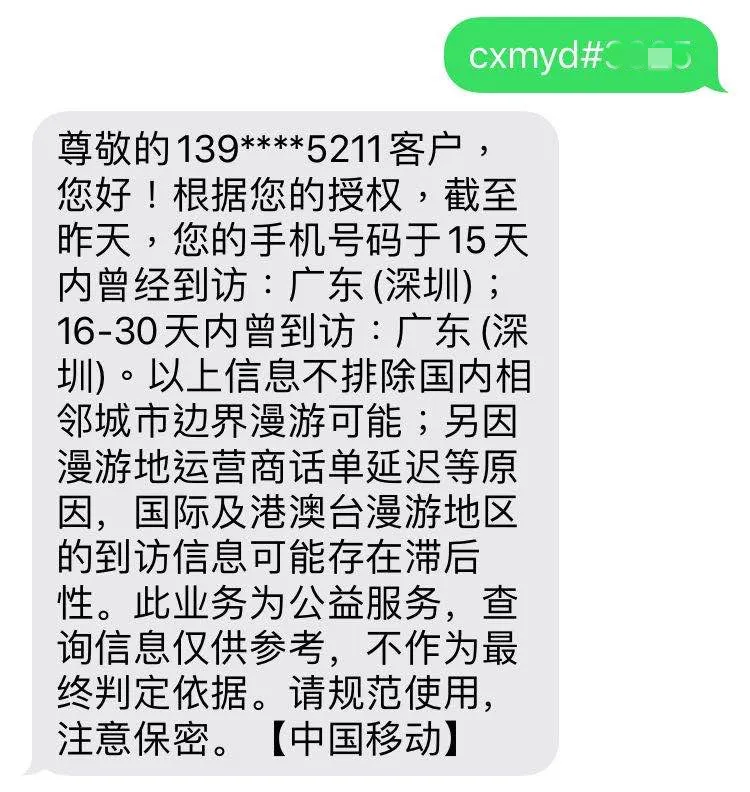 編輯短信CXMYD#身份證號碼后四位到10001,授權(quán)回復(fù)Y后,實現(xiàn)“漫游地查詢”,可查詢手機號近15日內(nèi)的途徑地信息。