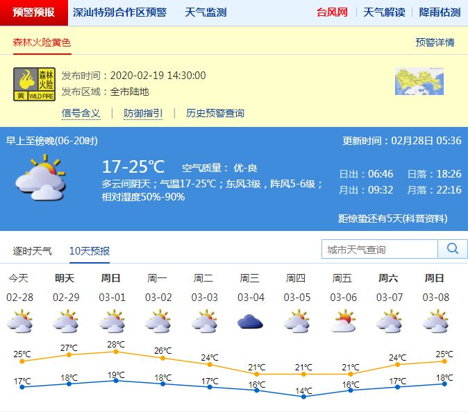 見圳客戶端·深圳新聞網(wǎng)2020年2月28日訊 深圳市氣象臺預(yù)計,27日晚到28日,深圳陰天間多云,氣溫18-25 ℃,相對濕度50%-95%,東風(fēng)3-4級,沿海、高地和海區(qū)陣風(fēng)可達(dá)7級;29日至3月3日多云為主,天氣總體溫暖,氣溫小幅波動,早晚有輕霧,偶有零星小雨;4日 -5日受冷空氣影響,氣溫明顯下降,其中4日有零星小雨。
