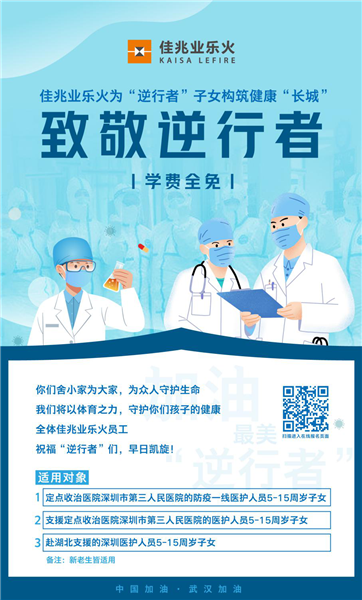 見圳客戶端·深圳新聞網(wǎng)2月29日訊(見圳客戶端、深圳新聞網(wǎng)記者 李云云 通訊員 張慧)突如其來(lái)的新冠肺炎疫情牽動(dòng)著人們的心,在這場(chǎng)沒有硝煙的戰(zhàn)斗中,廣大醫(yī)護(hù)人員舍小家為大家,日夜沖鋒守護(hù)在一線,成為這個(gè)特殊春節(jié)里最美的“逆行者”。日前,記者獲悉,佳兆業(yè)文體集團(tuán)旗下的佳兆業(yè)樂火國(guó)際文體學(xué)校將于3月1日到12月31日,為深圳定點(diǎn)收治醫(yī)院——深圳市第三人民醫(yī)院的防疫一線醫(yī)護(hù)人員以及赴鄂支援的深圳醫(yī)護(hù)人員子女提供免費(fèi)培訓(xùn)課程包,為“逆行者”子女構(gòu)筑健康“長(zhǎng)城”。