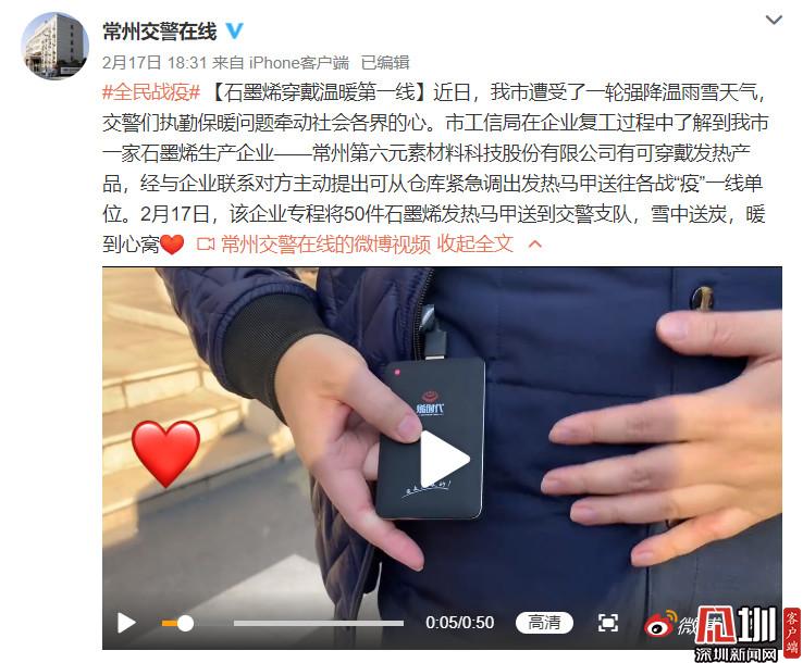 2月18日,一場大雪降臨常州,風大雪大溫度低,常州各單位一線工作者堅守崗位,一如既往地扎實做好疫情防控工作。烯旺科技聯(lián)合兄弟企業(yè)常州第六元素向奮斗中在抗疫中執(zhí)勤一線的常州交警支隊,惠山區(qū)公安局、惠山經濟開發(fā)區(qū)執(zhí)勤人員捐贈共計160件純石墨烯發(fā)熱馬甲,價值23.7萬元,以此向一線工作者送去溫暖,并致以崇高的敬意。